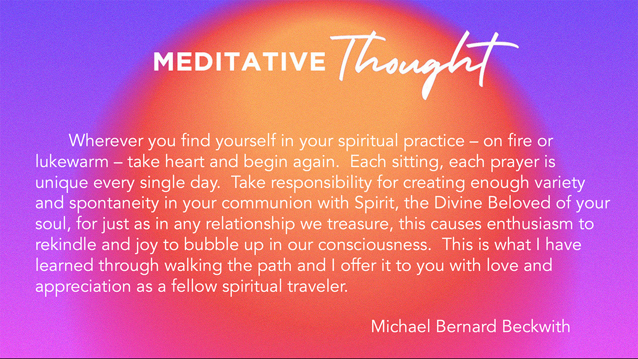 Wherever you find yourself in your spiritual practice – on fire or lukewarm – take heart and begin again. Each sitting, each prayer is unique every single day. Take responsibility for creating enough variety and spontaneity in your communion with Spirit, the Divine Beloved of your soul, for just as in any relationship we treasure, this causes enthusiasm to rekindle and joy to bubble up in our consciousness. This is what I have learned through walking the path and I offer it to you with love and appreciation as a fellow spiritual traveler.