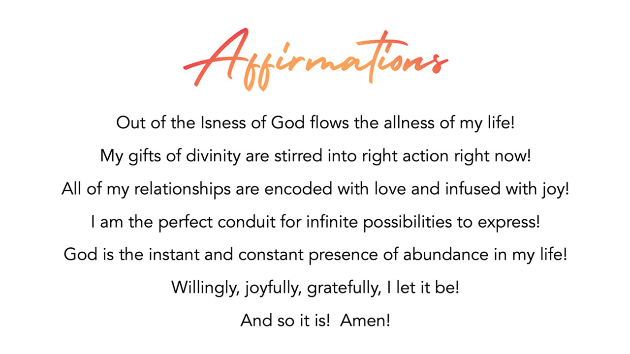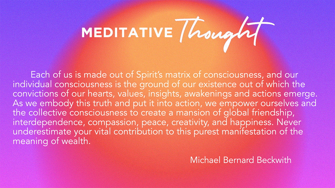 Each of us is made out of Spirit’s matrix of consciousness, and our individual consciousness is the ground of our existence out of which the convictions of our hearts, values, insights, awakenings and actions emerge. As we embody this truth and put it into action, we empower ourselves and the collective consciousness to create a mansion of global friendship, interdependence, compassion, peace, creativity, and happiness. Never underestimate your vital contribution to this purest manifestation of the meaning of wealth.