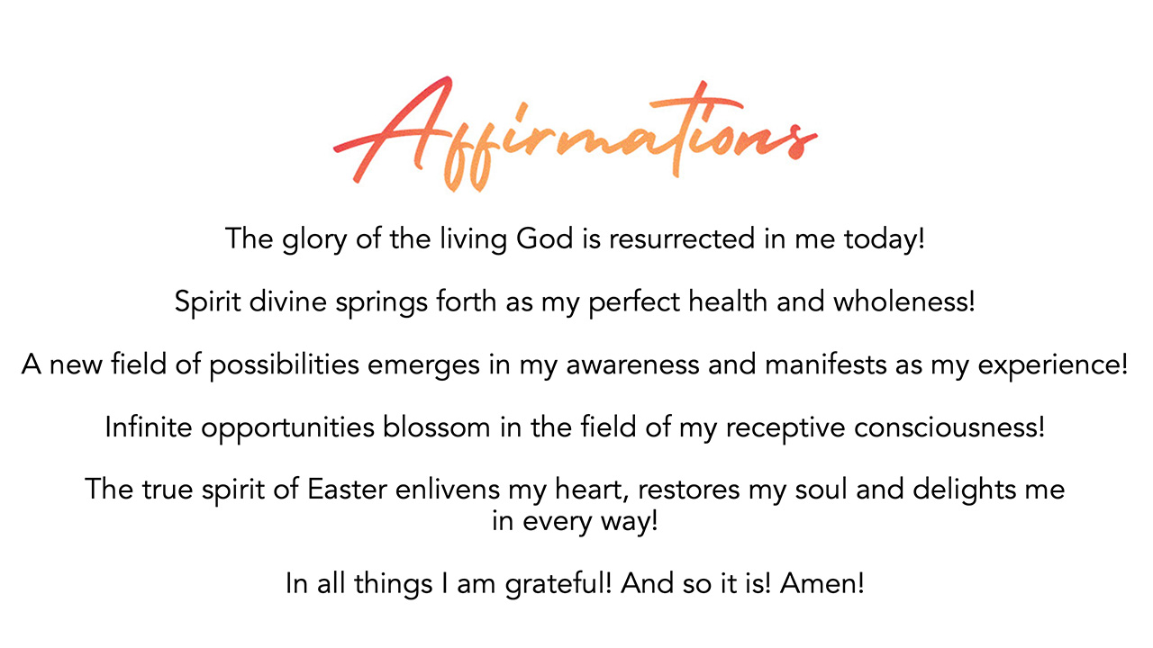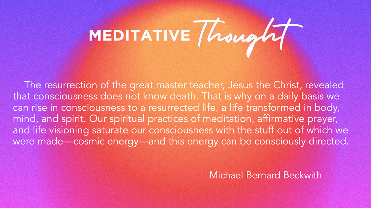 The resurrection of the great master teacher, Jesus the Christ, revealed that consciousness does not know death. That is why on a daily basis we can rise in consciousness to a resurrected life, a life transformed in body, mind, and spirit. Our spiritual practices of meditation, affirmative prayer, and life visioning saturate our consciousness with the stuff out of which we were made—cosmic energy—and this energy can be consciously directed.
