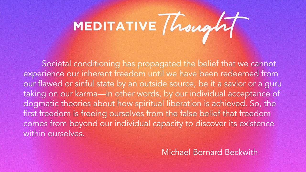 Societal conditioning has propagated the belief that we cannot experience our inherent freedom until we have been redeemed from our flawed or sinful state by an outside source, be it a savior or a guru taking on our karma—in other words, by our individual acceptance of dogmatic theories about how spiritual liberation is achieved. So, the first freedom is freeing ourselves from the false belief that freedom comes from beyond our individual capacity to discover its existence within ourselves.