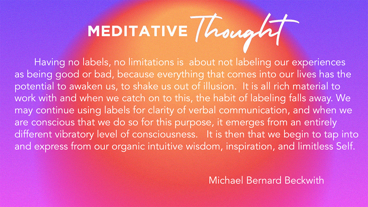 Having no labels, no limitations is about not labeling our experiences as being good or bad, because everything that comes into our lives has the potential to awaken us, to shake us out of illusion. It is all rich material to work with and when we catch on to this, the habit of labeling falls away. We may continue using labels for clarity of verbal communication, and when we are conscious that we do so for this purpose, it emerges from an entirely different vibratory level of consciousness. It is then that we begin to tap into and express from our organic intuitive wisdom, inspiration, and limitless Self.