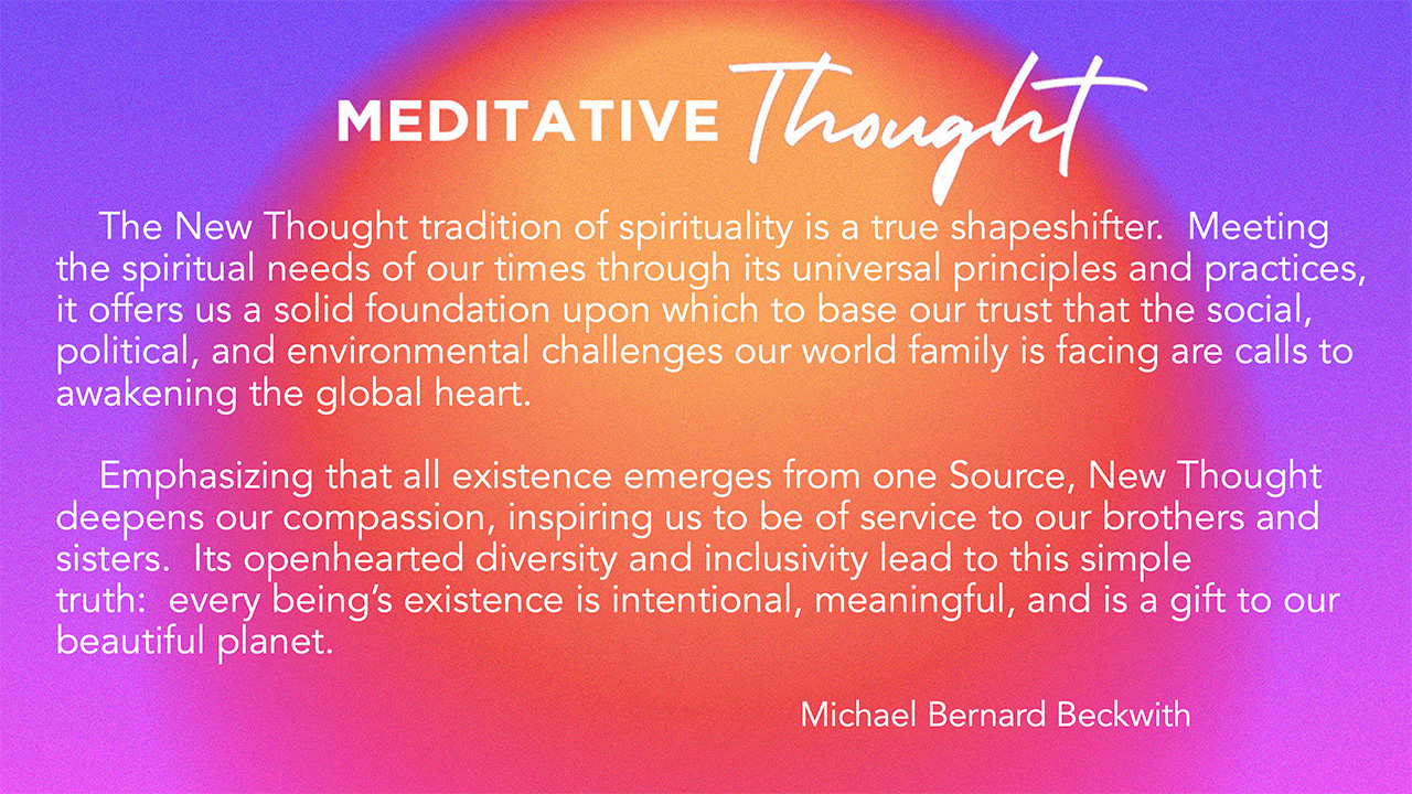Emphasizing that all existence emerges from one Source, New Thought deepens our compassion, inspiring us to be of service to our brothers and sisters. Its openhearted diversity and inclusivity lead to this simple truth: every being’s existence is intentional, meaningful, and is a gift to our beautiful planet.