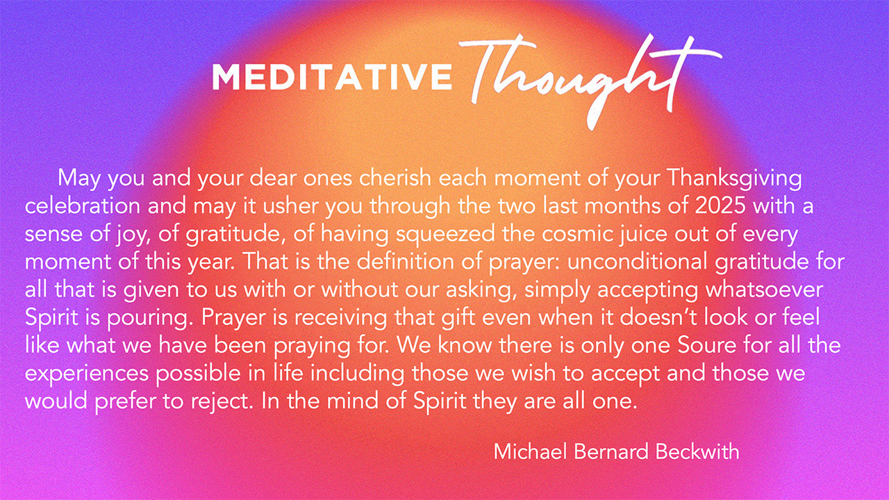 May you and your dear ones cherish each moment of your Thanksgiving celebration and may it usher you through the two last months of 2025 with a sense of joy, of gratitude, of having squeezed the cosmic juice out of every moment of this year. That is the definition of prayer: unconditional gratitude for all that is given to us with or without our asking, simply accepting whatsoever Spirit is pouring. Prayer is receiving that gift even when it doesn’t look or feel like what we have been praying for. We know there is only one Source of all the experiences possible in life including those we wish to accept and those we would prefer to reject. In the mind of Spirit they are all one.